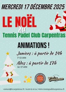 Animation Noël 2025 Chers parents, Chers joueurs, Le Tennis Padel club de Carpentras organise « Son Noël » le mercredi 17 décembre 2025. Le mercredi 17 décembre à l’issue de leur séance respective, tous les